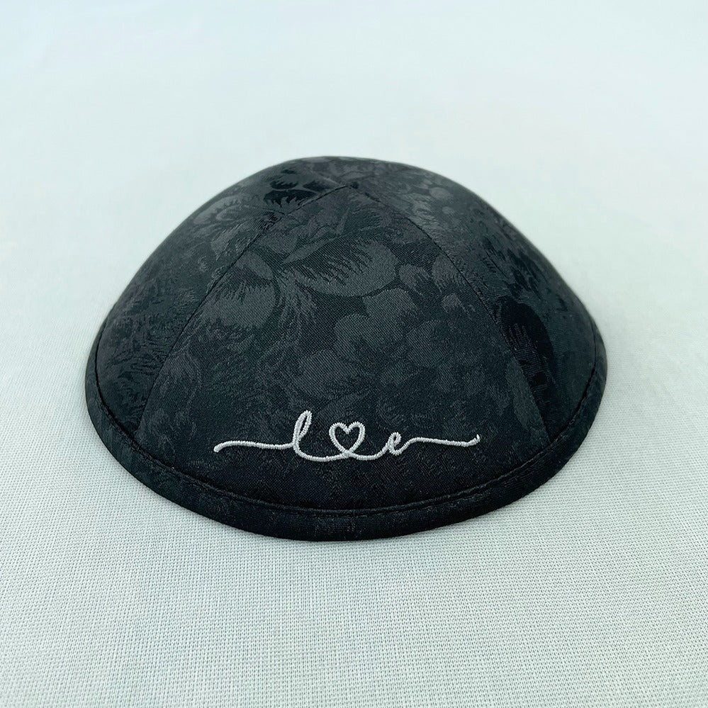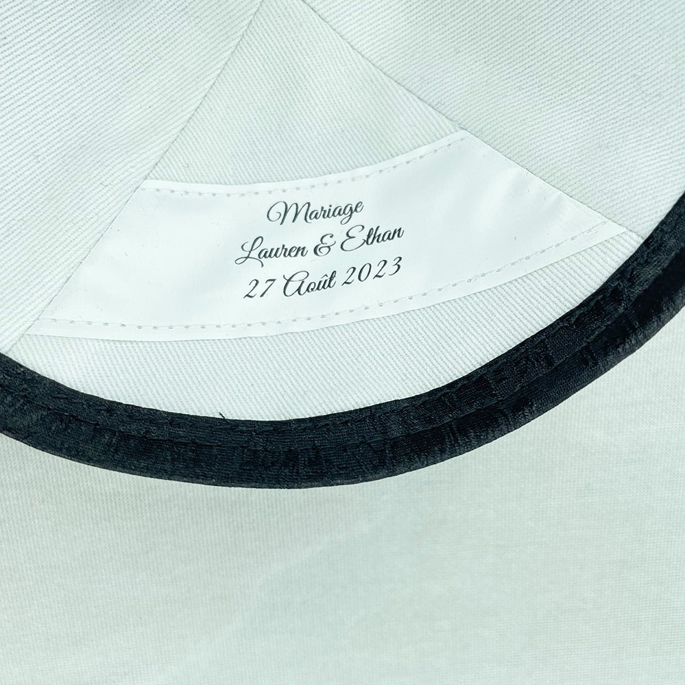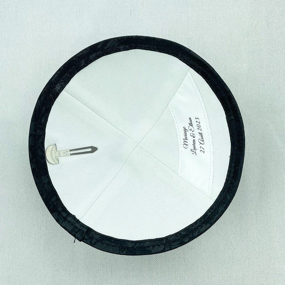 Personalisation Options: Embroidered monogram on the outside of cap, personalisation label with black printing stitched to the inside of cap. The design is completely customisable, including the embroidery (and colour / font / style of embroidery) on the outside of the kippot, as well as the type setting and font on the inside.