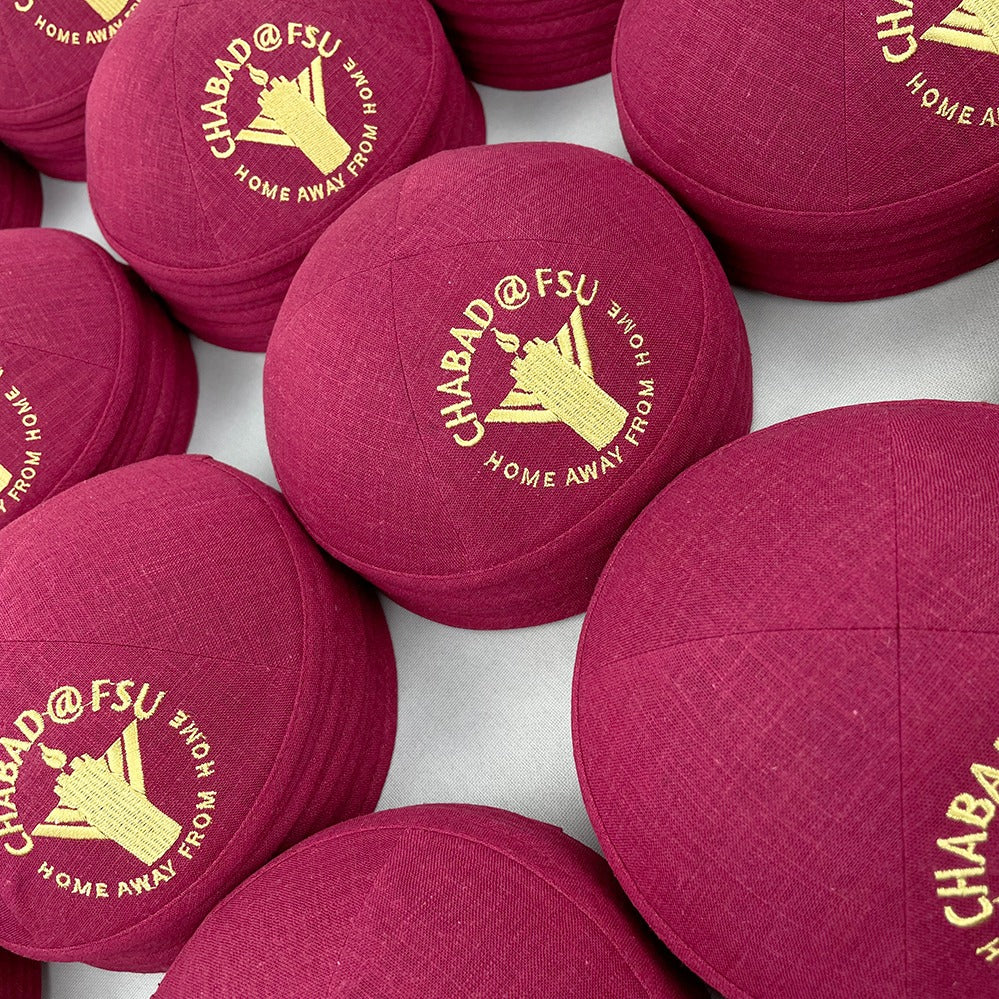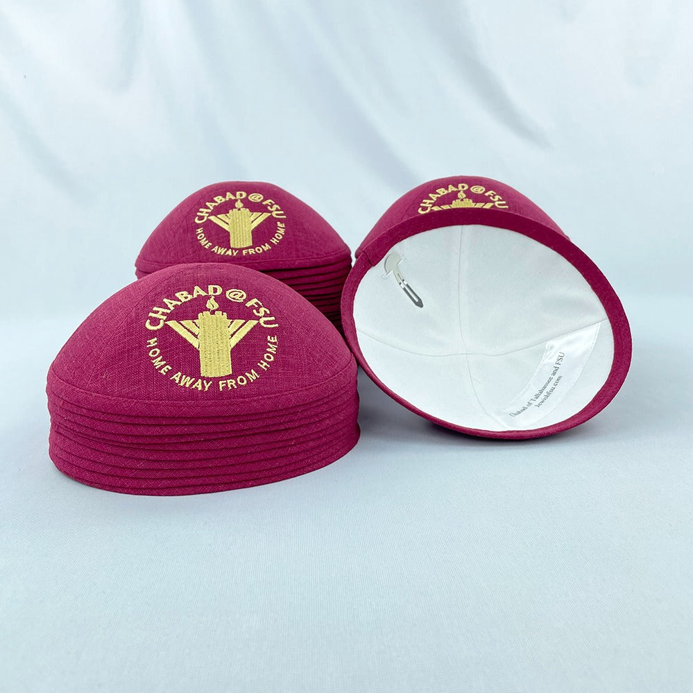 Personalisation Options: Embroidered monogram on the outside of cap, personalisation label with black printing stitched to the inside of cap. The design is completely customisable, including the embroidery (and colour / font / style of embroidery) on the outside of the kippot, as well as the type setting and font on the inside.